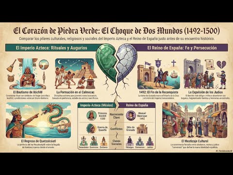 Esta obra narra la intersección de dos mundos a través de la vida de Alonso Manrique, un joven de linaje mixto en la España del siglo XV, y Xóchitl, una noble azteca en el México prehispánico. Los fragmentos detallan rituales religiosos, intrigas políticas y conflictos de fe tanto en la corte de Moctezuma como en la sociedad española de la Inquisición. Alonso viaja a las Indias, donde se convierte en intérprete de Hernán Cortés y vive el choque cultural de la conquista mientras busca proteger a su familia de persecuciones religiosas. La narrativa emplea el corazón de piedra verde como un símbolo místico que conecta los destinos de los protagonistas en medio de la guerra y la transformación espiritual. Finalmente, la historia aborda la redención y la justicia mediante el enfrentamiento de los personajes con sus orígenes y las instituciones de su tiempo.